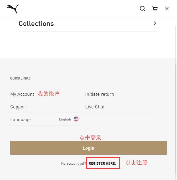 1、首先需要注册账户。点击展开右上角菜单,菜单最下方点击Login登录,新用户点击Register Here去注册账户。