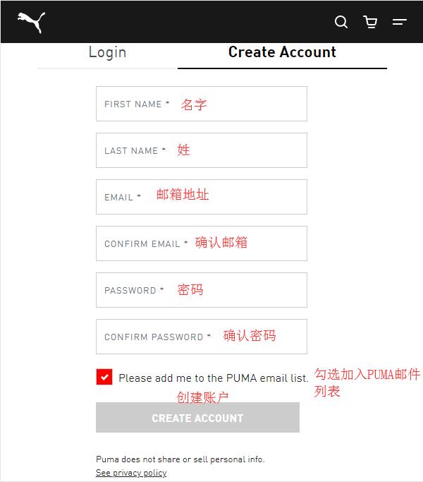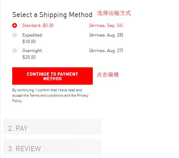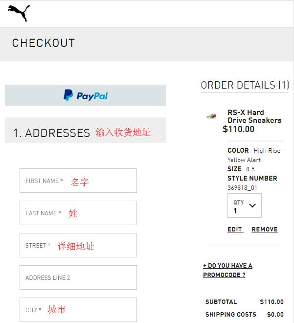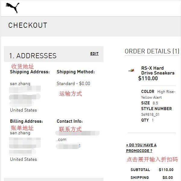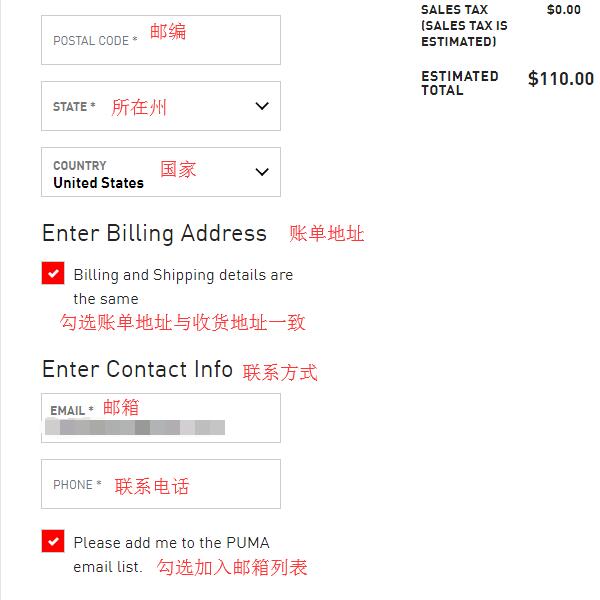 4、开始结算,输入收货地址。由于Puma官网目前还不支持直邮,所以这里收货地址还是输入美国的转运地址【还没注册的可以直接点击这里进行注册>>>】,账单地址可以跟收货地址一致,之后根据收货地址选择运输方式,然后点击Continue继续。
