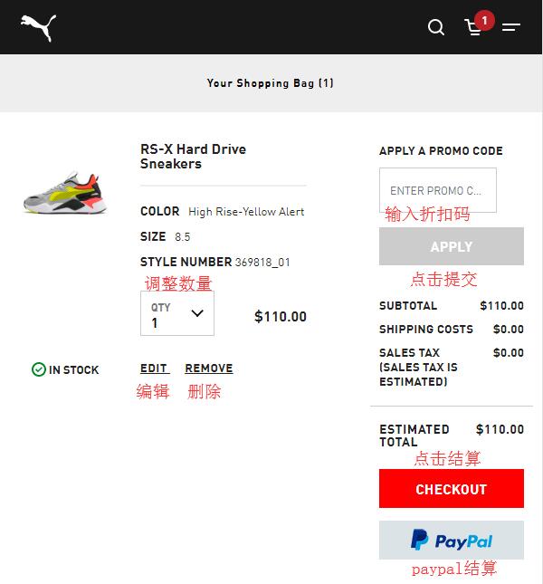 3、进入购物车,核对商品信息是否有误,确认无误点击checkout去结算,如果有折扣码还可以输入获取相应的优惠。