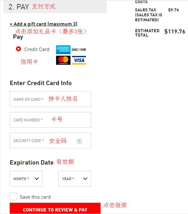 5、选择支付方式,如果有礼品卡,可以选择使用,每个订单最多可以使用3张。如果没有,还是使用信用卡支付,输入信用卡持卡人姓名,卡号,有效期等信息,然后点击Continue继续。