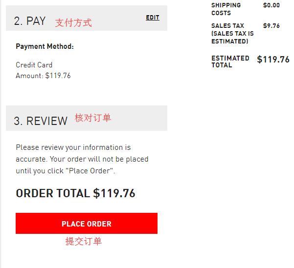 6、最后一步,核对并提交订单。在这里核对所有输入的地址,支付,以及订单信息,所有信息确认无误,点击Place Order提交订单,完成购买。