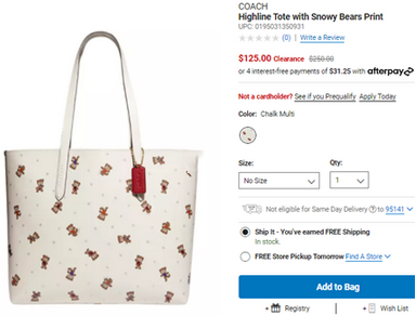 Belk这款COACH Highline 可爱卡通托特包,白色款有货,售价降至5折$125,美境满$59免邮;》》直达链接