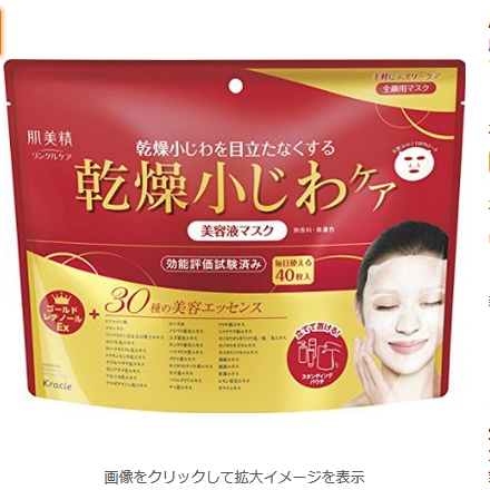 Kracie 肌美精 Wrinkle Care 保湿滋润护理面膜含有超过30种美容精华,如维A醇EX、蜂王乳,可渗透到角质深层,淡化干燥小细纹,给予肌肤润泽紧致。玻尿酸等保湿成分可有效锁住面部肌肤的水分。虽然不是独立包装,但封口严密确保包内的美容液不会干,全脸可每天使用。