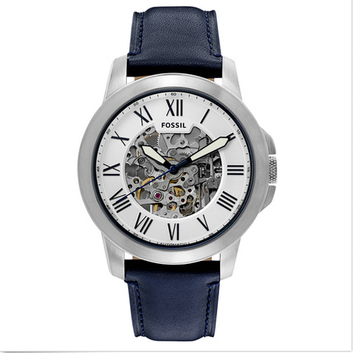 这款FOSSIL Grant ME3111 男士机械腕表,采用自动机械机芯,动力储存为40小时。不锈钢表壳搭配深蓝色皮带,款式儒雅。白色表盘中部为镂空骨架设计,十分精美。银色夜光指针、黑色罗马数字时标,外圈为分钟显示。防刮擦矿物水晶表镜,表径45mm,厚度12mm,防水50米。