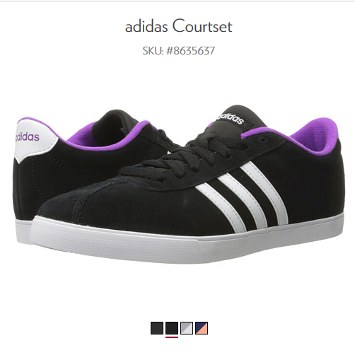 这款Adidas阿迪达斯Courtset女士经典真皮logo板鞋,时尚经典,采用真皮材质,黑紫白三色拼接,黑色为主色调,经典白色三道杠标志,更像
