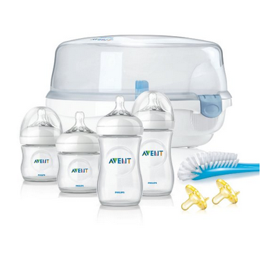 这款PHILIPS Avent BPA Free Natural EssentialsGift Set礼品盒装包含2个宽口径的260ml奶瓶,2个120ml奶瓶,2个安抚奶嘴,一个奶瓶刷以及一个微波炉专用消毒锅。采用半透明的PP材质,抗腐蚀、耐高温性能都比较出色。奶瓶为12年底推出的自然原生系列,特别根据母乳胸型设计,符合婴儿进食原则,让宝宝不会过于排斥奶瓶。广口的设计方便冲洗, 干净卫生。贴心的奶瓶刷可以很方便地清洗内部,方便再次使用。安抚奶嘴就是经常要用到的了。另外配有微波炉专用消毒锅,可以将奶瓶等用品放进去一起消毒, 婴儿用品还是谨慎一些比较好。