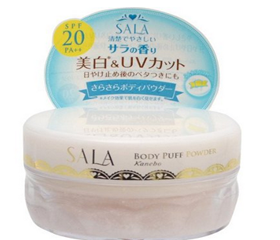 嘉娜宝SALA美白防晒身体粉,是日亚同品类销量冠军。配合胶原蛋白与美白保湿成分使肌肤娇嫩白皙。粉末有吸收油脂作用与SPF20、PA++ 抗UV功能。用完防晒霜后,轻轻的表面拍一层,具有防晒和柔和肌肤颜色之用,用于脸部及全身。白色款是哑光,非常自然美白的身体粉,最主要的是细腻,轻薄 无负担又保湿。香味基调以水仙,鸢尾花为主。