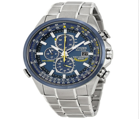 西铁城 AT8020-54L款腕表被命名为“Blue Angels”,这款腕表表壳经过蓝离子电镀处理,表带采用不锈钢材质。搭载Eco-Drive光动能机芯,任何可见光源的存在就能为其充电,满电后在无光环境也可提供2个月的精准走时。支持世界26个城市电波自动精确对时(欧美日中),蓝宝石防刮水晶玻璃表镜,表盘宽度43mm,三眼计时功能,3点钟位置显示日期。